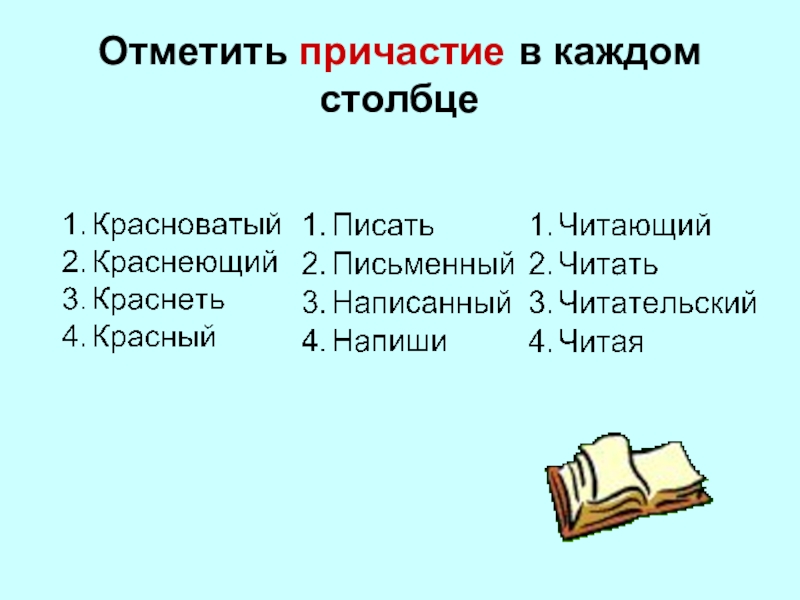 Причастия изменяются по родам…………………………….., как и ………………… .