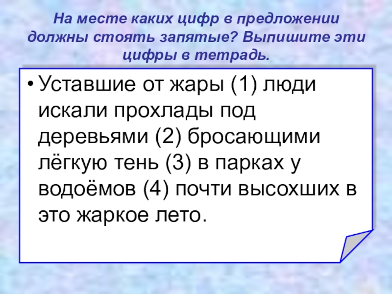 Слайд 18На месте каких цифр в предложении должны стоять запятые? Выпишите эти