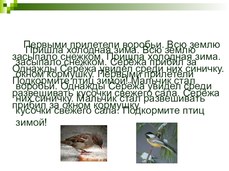Пришла холодная зима. Всю землю засыпало снежком. Серёжа прибил за окном кормушку. Первыми прилетели воробьи. Однажды Серёжа увидел среди них синичку. Мальчик стал развешивать кусочки свежего сала. Подкормите птиц зимой!