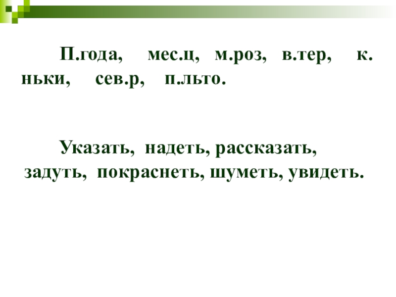 Указать, надеть, рассказать, задуть, покраснеть, шуметь, увидеть.