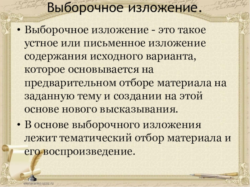 В основе выборочного изложения лежит тематический отбор материала и его воспроизведение.