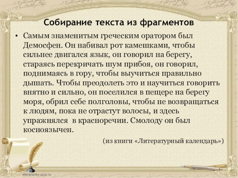 Самым знаменитым греческим оратором был Демосфен. Он набивал