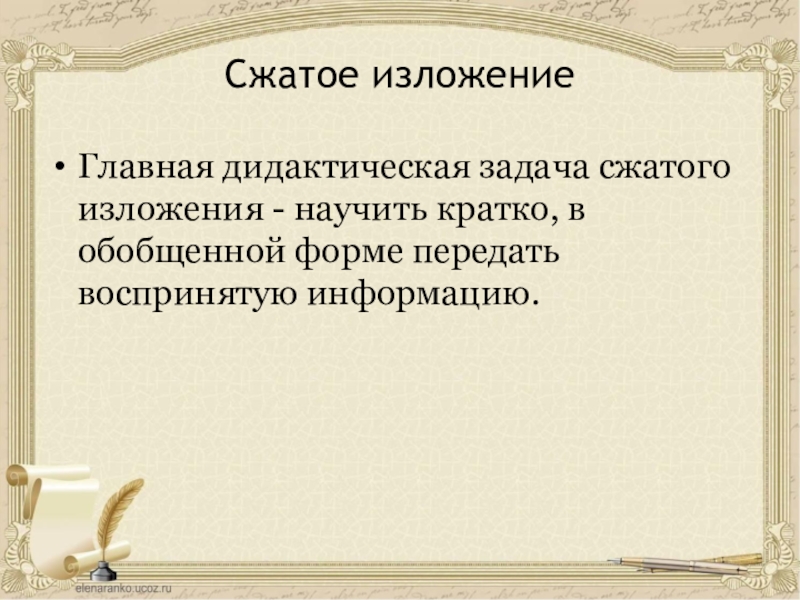 Главная дидактическая задача сжатого изложения - научить кратко, в обобщенной