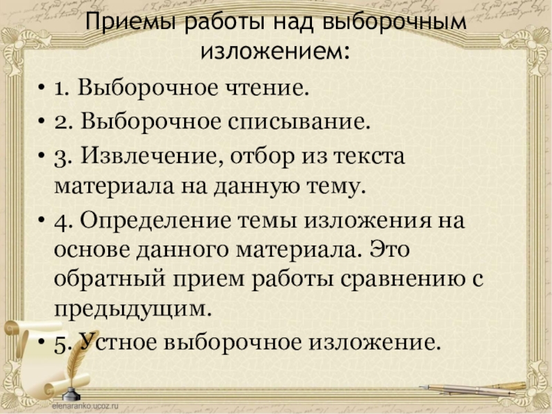 Приемы работы над выборочным изложением: