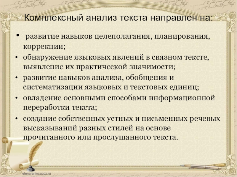 Слайд 5Комплексный анализ текста направлен на: