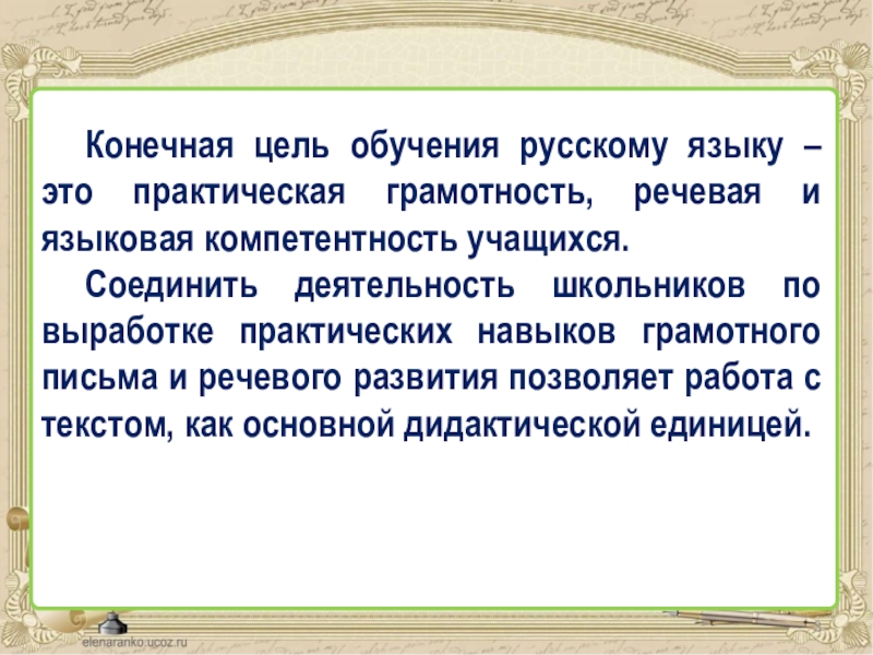 Слайд 3 Конечная цель обучения русскому языку – это практическая грамотность, речевая