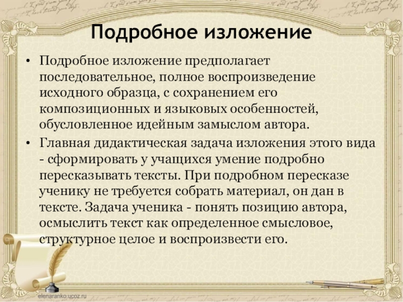 Главная дидактическая задача изложения этого вида - сформировать у учащихся умение подробно пересказывать тексты. При подробном пересказе ученику не требуется собрать материал, он дан в тексте. Задача ученика - понять позицию автора, осмыслить текст как определенное смысловое, структурное целое и воспроизвести его.