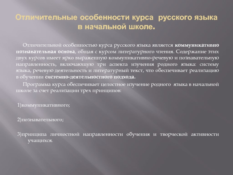 Программа курса обеспечивает целостное изучение родного языка в начальной школе за счет реализации трех принципов: