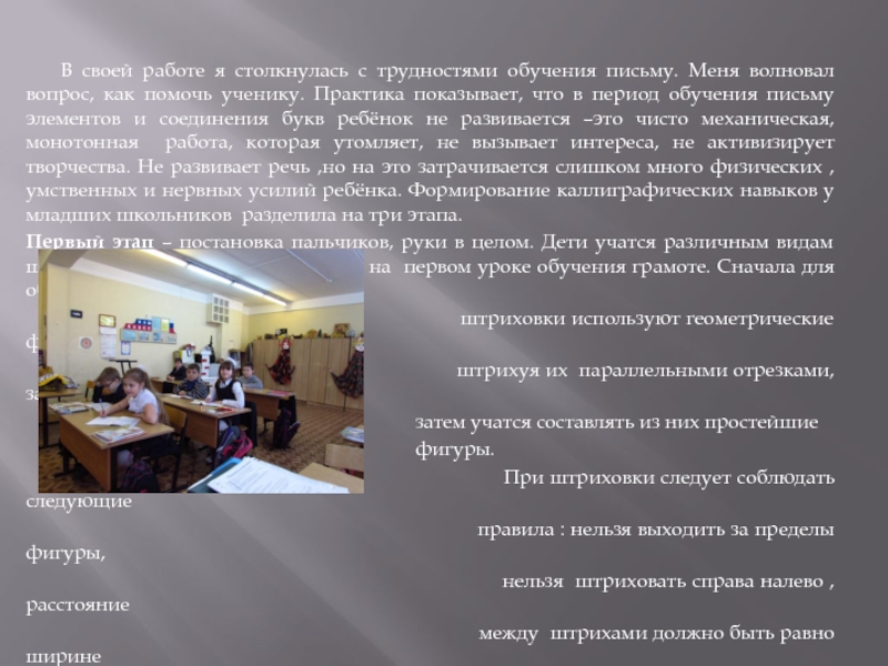вопрос, как помочь ученику. Практика показывает, что в период обучения письму элементов и соединения букв ребёнок не развивается –это чисто механическая, монотонная работа, которая утомляет, не вызывает интереса, не активизирует творчества. Не развивает речь ,но на это затрачивается слишком много физических , умственных и нервных усилий ребёнка. Формирование каллиграфических навыков у младших школьников разделила на три этапа.