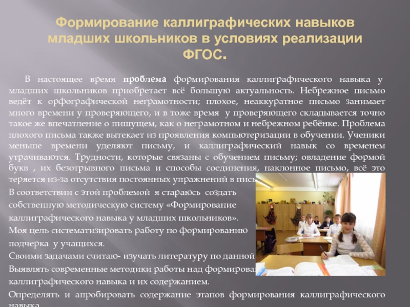 Слайд 4Формирование каллиграфических навыков младших школьников в условиях реализации ФГОС.