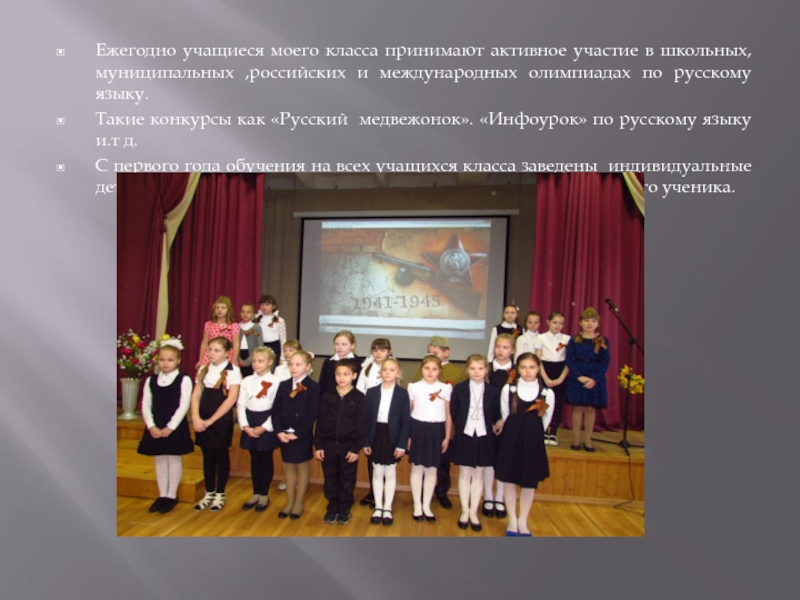 Слайд 9Ежегодно учащиеся моего класса принимают активное участие в школьных, муниципальных ,российских