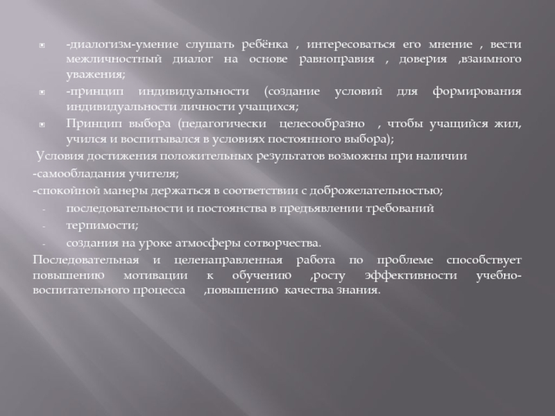 - Педагогический гуманизм (принятие всех учащихся , доверие к ним, уверенность в их способностях, соблюдение их интересов);