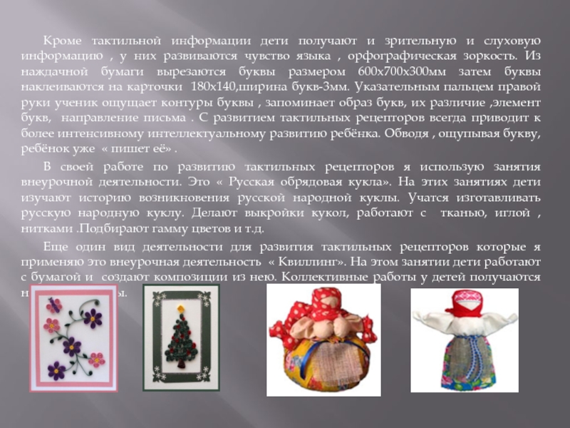 В своей работе по развитию тактильных рецепторов я использую занятия внеурочной деятельности. Это « Русская обрядовая кукла». На этих занятиях дети изучают историю возникновения русской народной куклы. Учатся изготавливать русскую народную куклу. Делают выкройки кукол, работают с тканью, иглой ,нитками .Подбирают гамму цветов и т.д.