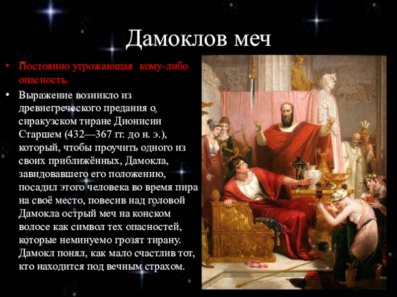 о сиракузском тиране Дионисии Старшем (432—367 гг. до н. э.), который, чтобы проучить одного из своих приближённых, Дамокла, завидовавшего его положению, посадил этого человека во время пира на своё место, повесив над головой Дамокла острый меч на конском волосе как символ тех опасностей, которые неминуемо грозят тирану. Дамокл понял, как мало счастлив тот, кто находится под вечным страхом.