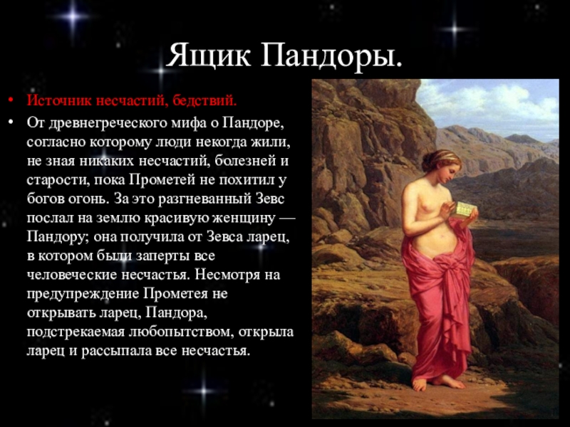 люди некогда жили, не зная никаких несчастий, болезней и старости, пока Прометей не похитил у богов огонь. За это разгневанный Зевс послал на землю красивую женщину — Пандору; она получила от Зевса ларец, в котором были заперты все человеческие несчастья. Несмотря на предупреждение Прометея не открывать ларец, Пандора, подстрекаемая любопытством, открыла ларец и рассыпала все несчастья.