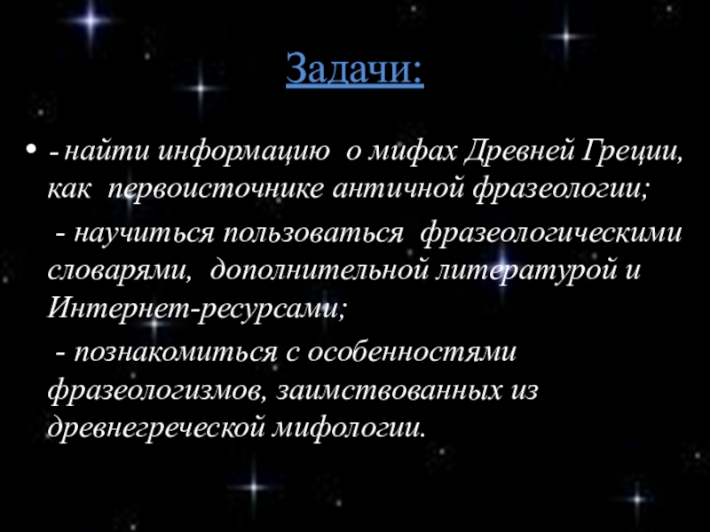 - найти информацию о мифах Древней Греции, как первоисточнике античной фразеологии;