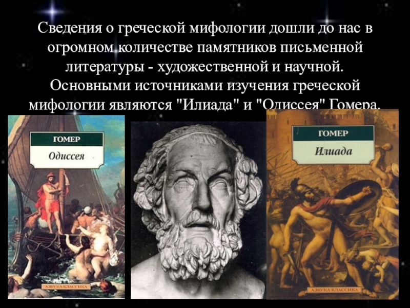 письменной литературы - художественной и научной. Основными источниками изучения греческой мифологии являются "Илиада" и "Одиссея" Гомера.