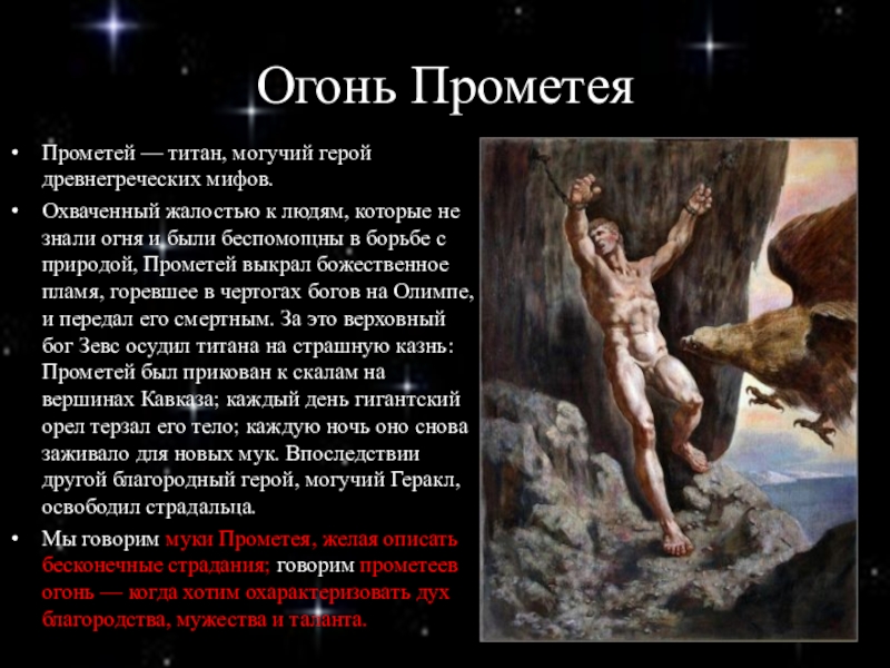 Мы говорим муки Прометея, желая описать бесконечные страдания; говорим прометеев огонь — когда хотим охарактеризовать дух благородства, мужества и таланта.