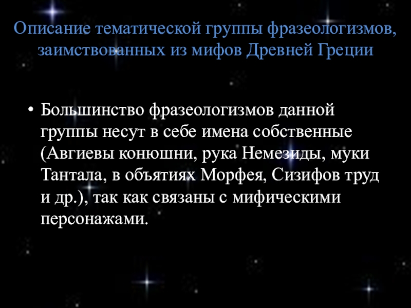 Слайд 33Описание тематической группы фразеологизмов, заимствованных из мифов Древней Греции