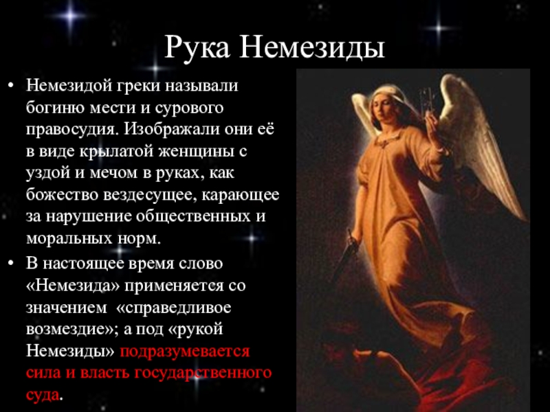 Немезидой греки называли богиню мести и сурового правосудия. Изображали они