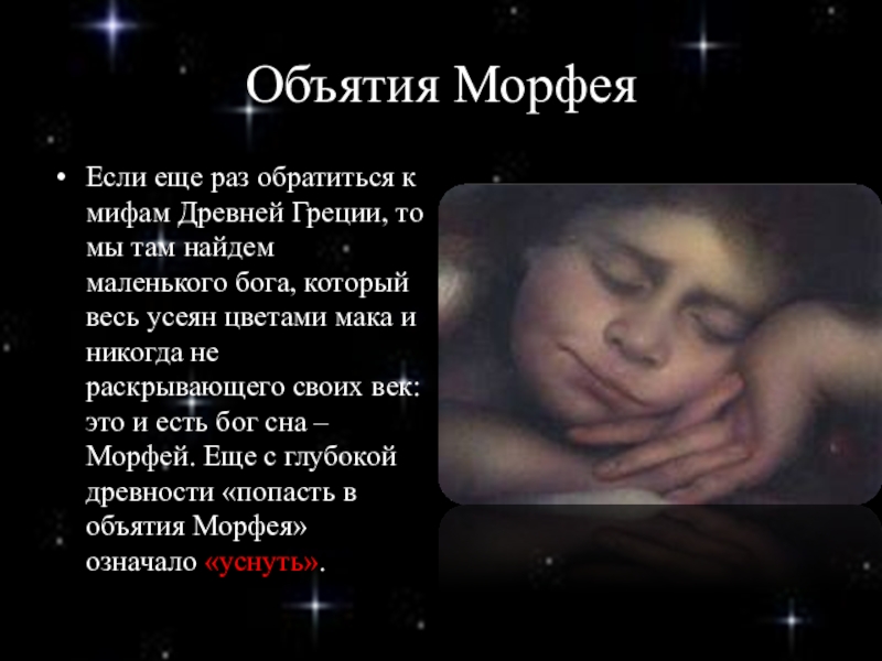 там найдем маленького бога, который весь усеян цветами мака и никогда не раскрывающего своих век: это и есть бог сна – Морфей. Еще с глубокой древности «попасть в объятия Морфея» означало «уснуть».