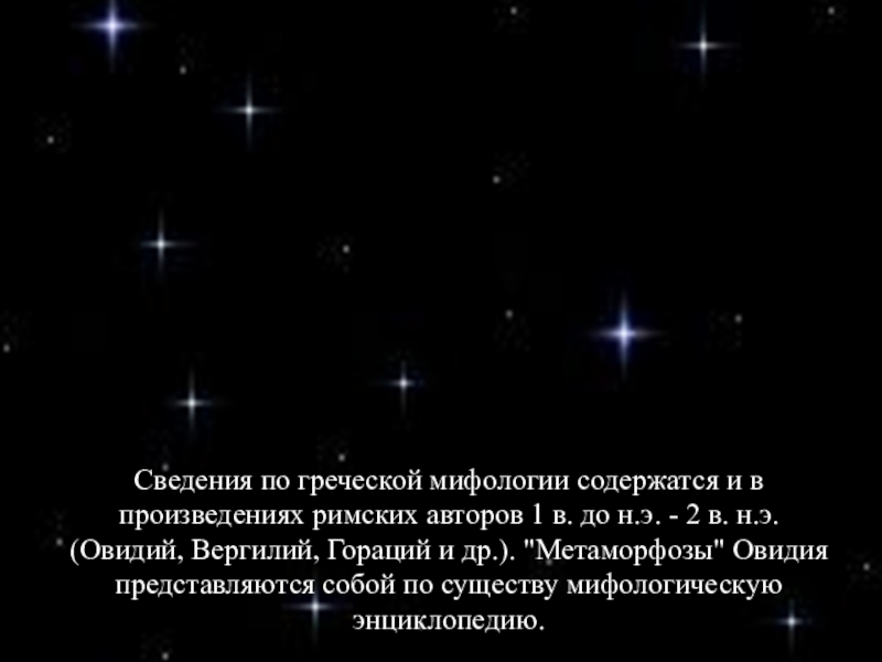 в. до н.э. - 2 в. н.э. (Овидий, Вергилий, Гораций и др.). "Метаморфозы" Овидия представляются собой по существу мифологическую энциклопедию.