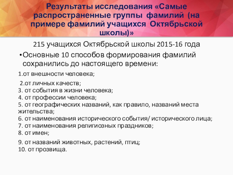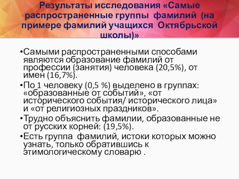 Самыми распространенными способами являются образование фамилий от профессии (занятия) человека (20,5%), от имен (16,7%).
