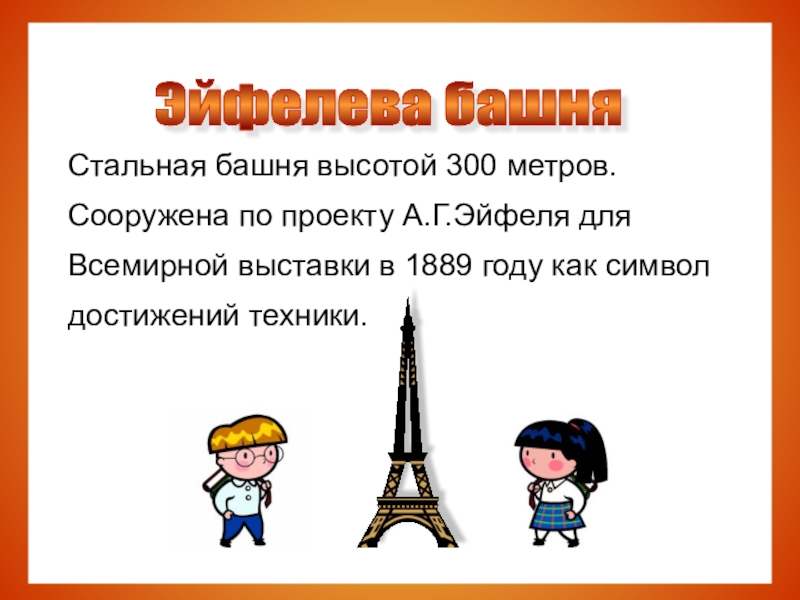 Сооружена по проекту А.Г.Эйфеля для Всемирной выставки в 1889 году как символ достижений техники.