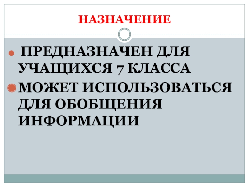 НАЗНАЧЕНИЕ ПРЕДНАЗНАЧЕН ДЛЯ УЧАЩИХСЯ 7 КЛАССАМОЖЕТ ИСПОЛЬЗОВАТЬСЯ ДЛЯ ОБОБЩЕНИЯ ИНФОРМАЦИИ