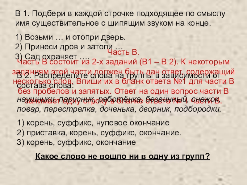 В 1. Подбери в каждой строчке подходящее по смыслу имя существительное с шипящим звуком на конце.