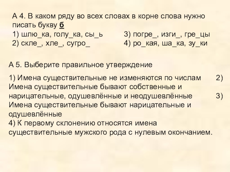 1) Имена существительные не изменяются по числам 2) Имена существительные бывают собственные и нарицательные, одушевлённые и неодушевлённые 3) Имена существительные бывают нарицательные и одушевлённые 4) К первому склонению относятся имена существительные мужского рода с нулевым окончанием.
