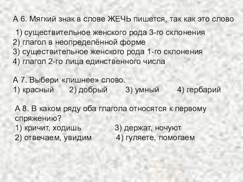 А 8. В каком ряду оба глагола относятся к первому спряжению? 1) кричит, ходишь 3) держат, ночуют 2) отвечаем, увидим 4) гуляете, помогаем