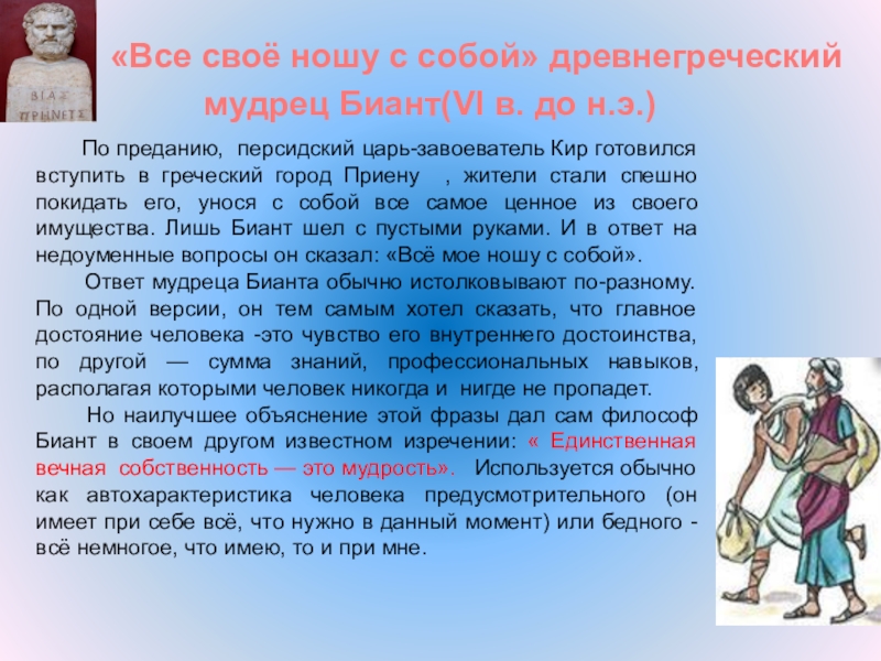 Слайд 27 «Все своё ношу с собой» древнегреческий мудрец Биант(VI