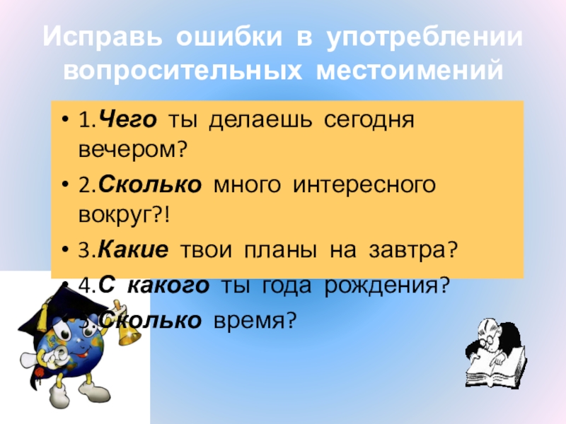 Слайд 16Исправь ошибки в употреблении вопросительных местоимений