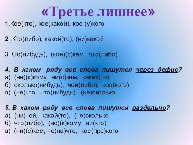 3.Кто(нибудь), (кое)(с)кем, что(либо)