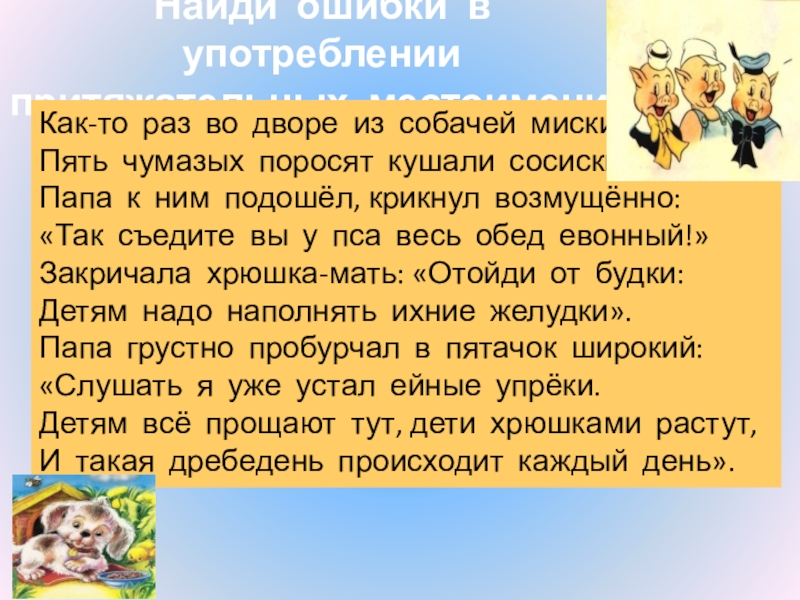 Слайд 19Найди ошибки в употреблении притяжательных местоимений
