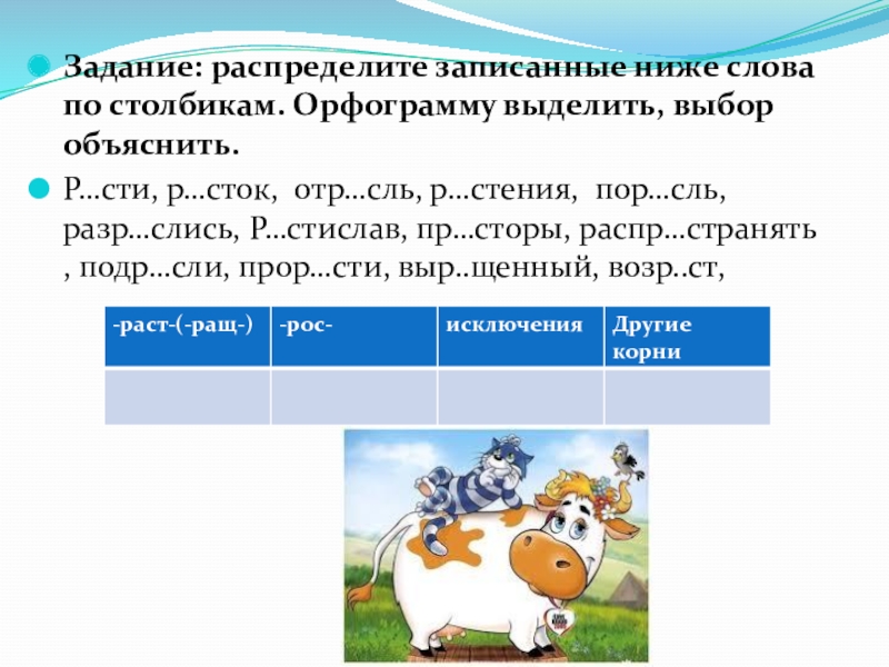 Задание: распределите записанные ниже слова по столбикам. Орфограмму выделить, выбор объяснить. Р…сти, р…сток, отр…сль, р…стения, пор…сль, разр…слись,