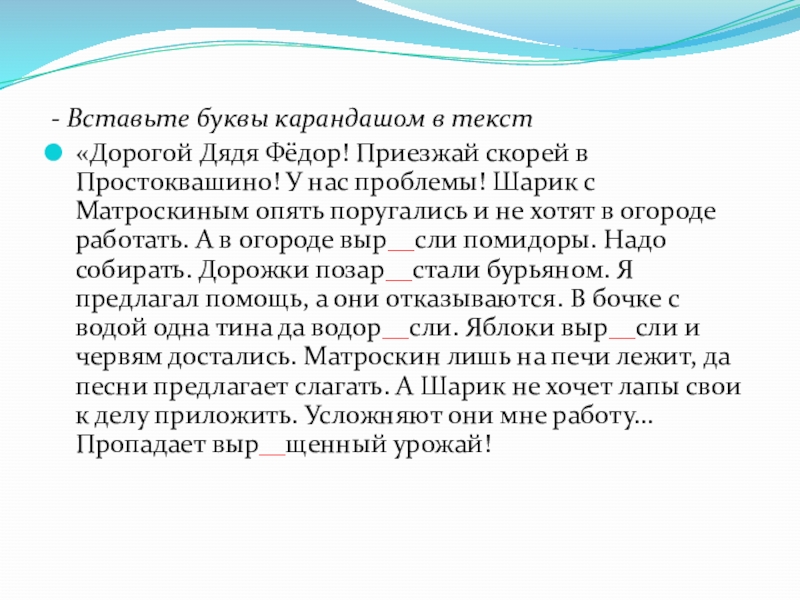 - Вставьте буквы карандашом в текст«Дорогой Дядя Фёдор! Приезжай скорей в Простоквашино! У нас проблемы! Шарик с