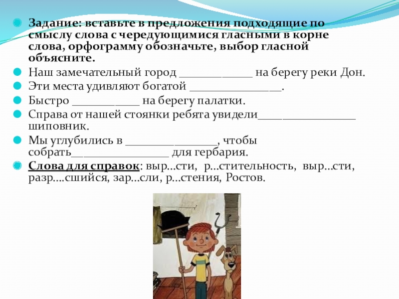 Задание: вставьте в предложения подходящие по смыслу слова с чередующимися гласными в корне слова, орфограмму обозначьте, выбор