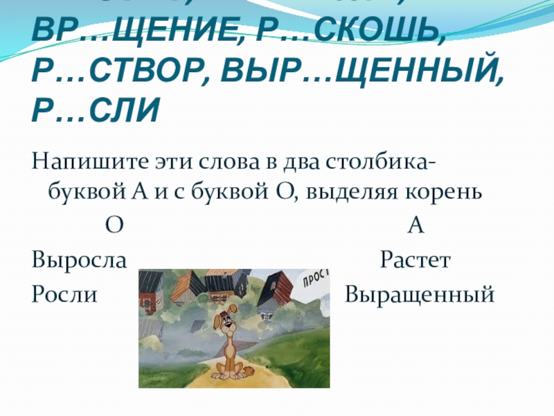 Слайд 4Р…СТЕТ, ВЫР…СЛА, ВР…ЩЕНИЕ, Р…СКОШЬ, Р…СТВОР, ВЫР…ЩЕННЫЙ, Р…СЛИ