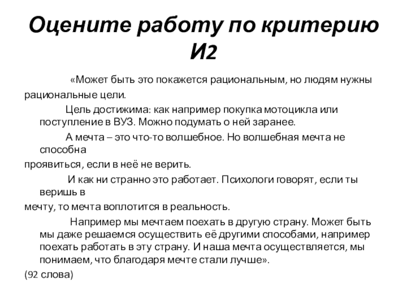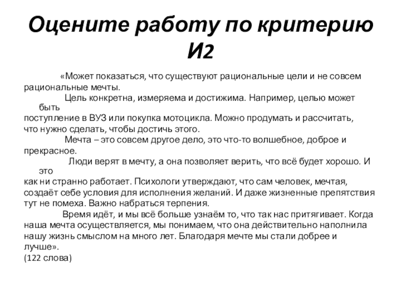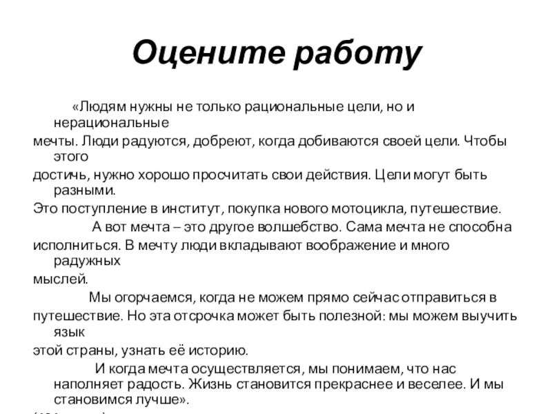 Например, человек мечтает съездить в далёкую страну, огорчается, что не может сделать это сейчас. Но время идёт, он всё больше узнаёт о желаемом, решает связать с этой страной свою профессию. Когда же мечта исполняется, он понимает, что она наполнила его жизнь, сделала его лучше».