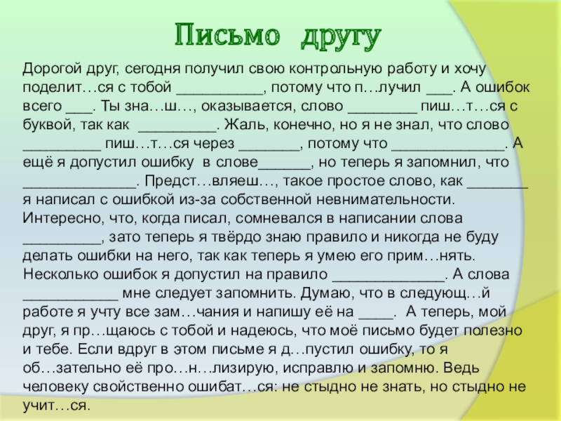 поделит…ся с тобой __________, потому что п…лучил ___. А ошибок всего ___. Ты зна…ш…, оказывается, слово ________ пиш…т…ся с буквой, так как _________. Жаль, конечно, но я не знал, что слово _________ пиш…т…ся через _______, потому что _____________. А ещё я допустил ошибку в слове______, но теперь я запомнил, что _____________. Предст…вляеш…, такое простое слово, как _______ я написал с ошибкой из-за собственной невнимательности. Интересно, что, когда писал, сомневался в написании слова _________, зато теперь я твёрдо знаю правило и никогда не буду делать ошибки на него, так как теперь я умею его прим…нять. Несколько ошибок я допустил на правило _____________. А слова ___________ мне следует запомнить. Думаю, что в следующ…й работе я учту все зам…чания и напишу её на ____. А теперь, мой друг, я пр…щаюсь с тобой и надеюсь, что моё письмо будет полезно и тебе. Если вдруг в этом письме я д…пустил ошибку, то я об…зательно её про…н…лизирую, исправлю и запомню. Ведь человеку свойственно ошибат…ся: не стыдно не знать, но стыдно не учит…ся.