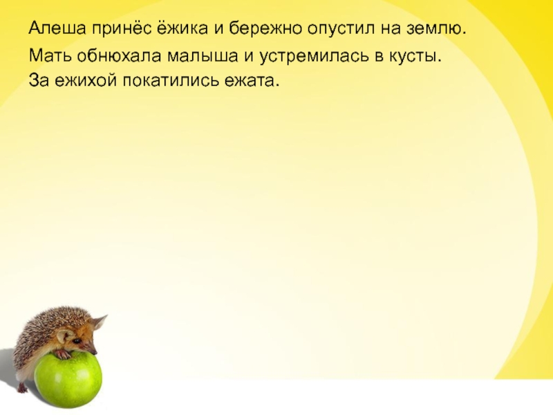 Алёша принёс ёжика и бережно опустил на землю. Мать обнюхала малыша и устремилась в кусты. За ежихой покатились ежата.