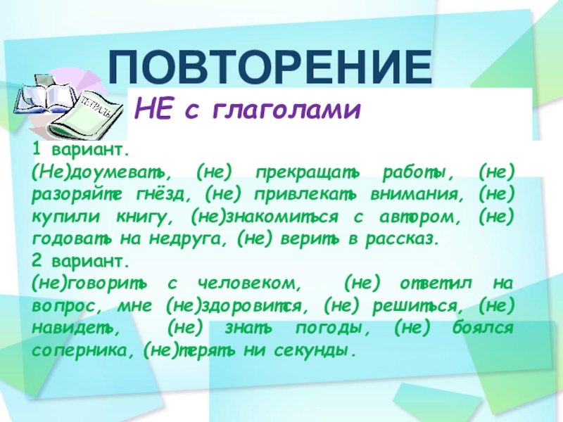 Не говорить с человеком, не ответил на вопрос, мне нездоровится, не решиться, ненавидеть, не знать погоды, не боялся соперника, не терять ни секунды.