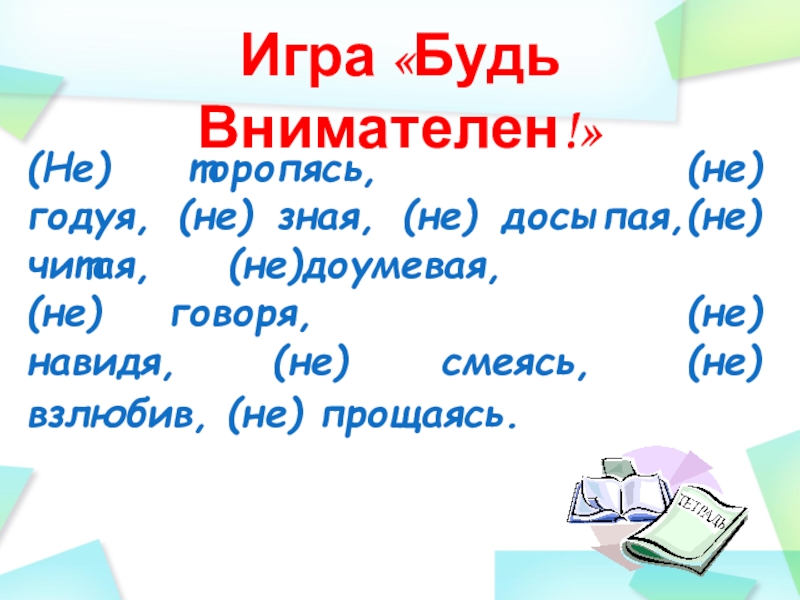 (Не) торопясь, (не) годуя, (не) зная, (не) досыпая,(не)читая, (не)доумевая,