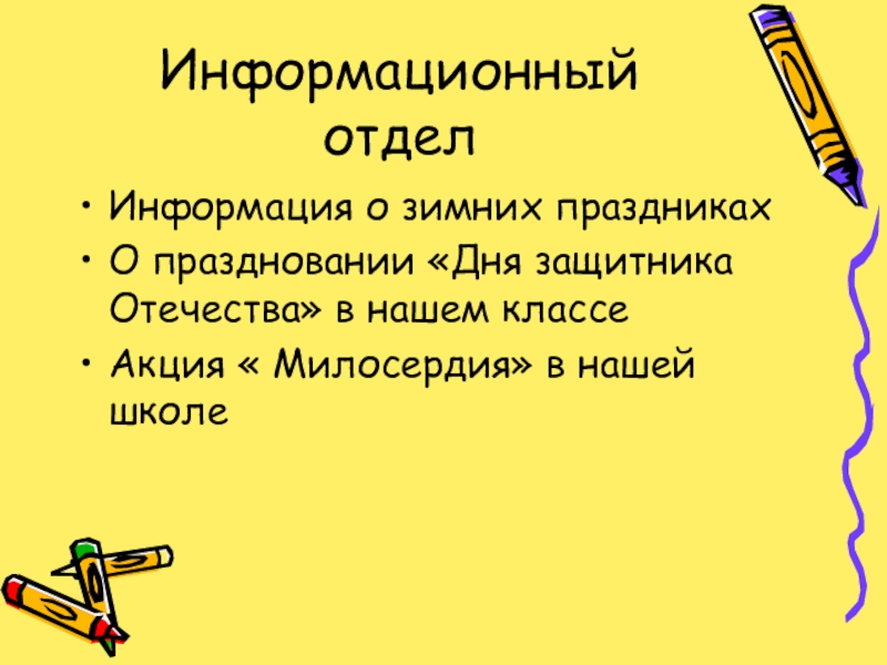 Информационный отделИнформация о зимних праздникахО праздновании «Дня защитника Отечества» в нашем классеАкция « Милосердия» в нашей