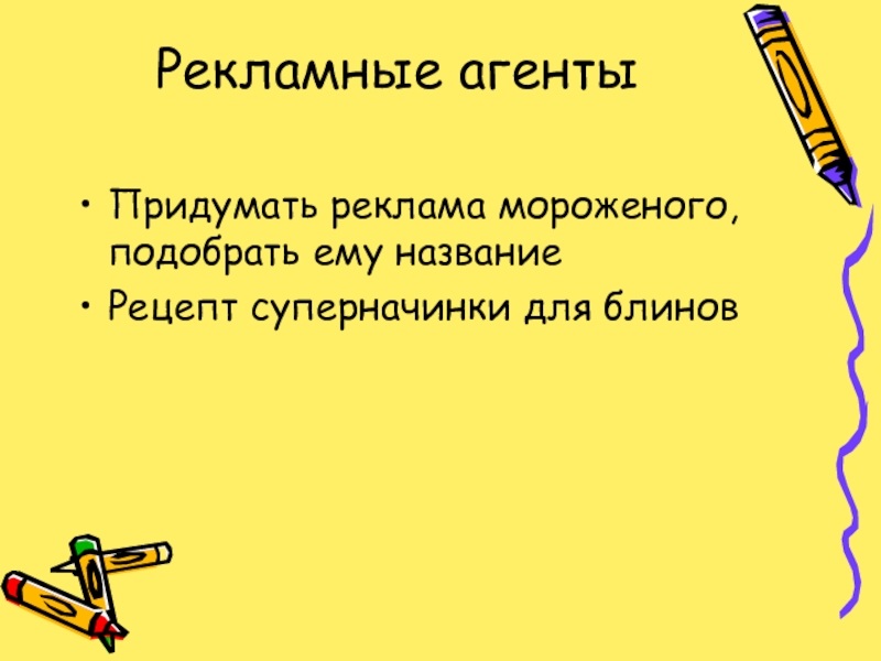 Рекламные агенты Придумать реклама мороженого, подобрать ему названиеРецепт суперначинки для блинов