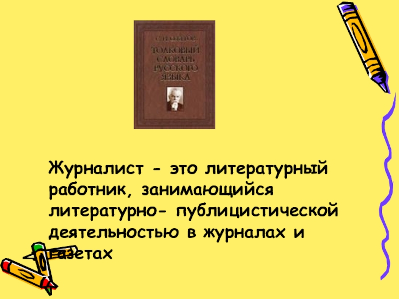 Журналист - это литературный работник, занимающийся литературно- публицистической деятельностью в журналах и газетах