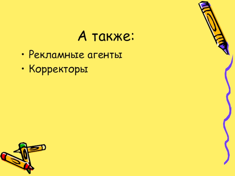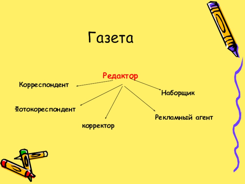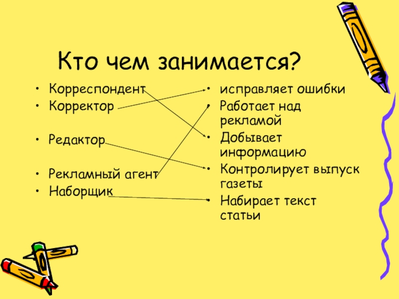 Кто чем занимается?КорреспондентКорректорРедактор Рекламный агентНаборщик исправляет ошибкиРаботает над рекламойДобывает информациюКонтролирует выпуск газетыНабирает текст статьи