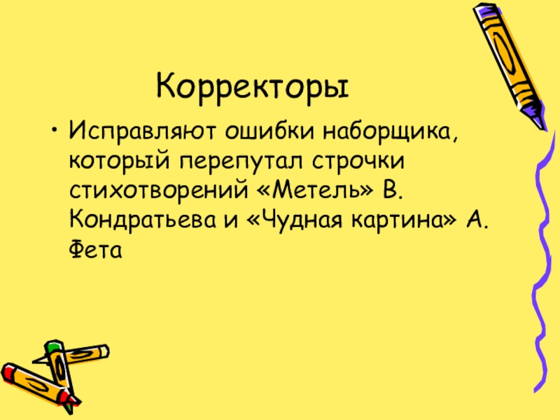 Корректоры Исправляют ошибки наборщика, который перепутал строчки стихотворений «Метель» В.Кондратьева и «Чудная картина» А.Фета